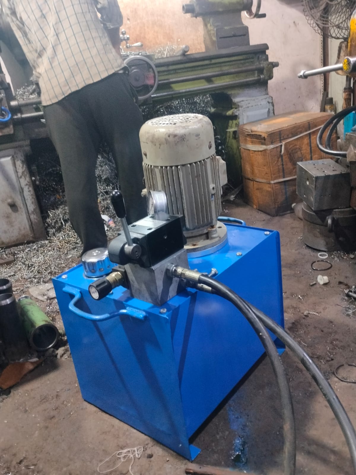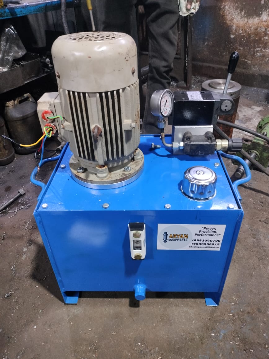 Aryan Equipments Hydraulic Power Pack is designed for smooth, reliable, and continuous hydraulic pressure supply for all types of industrial machines. Our power packs are custom-built as per machine requirement and deliver high efficiency, zero-leakage performance, and long service life. These units are widely used in hydraulic cylinders, H-frame presses, C-frame presses, baling presses, scissor lifts, moulding machines, industrial automation, and material handling systems. Each power pack is equipped with high-grade components such as gear pump/piston pump, solenoid valves, CETOP directional valves, pressure relief valve, return line filter, suction strainer, and heavy-duty MS oil tank. Cooling options include air oil cooler and heat exchanger for continuous-duty machines. Aryan Equipments manufactures power packs from 1 HP to 30 HP with tank capacity from 10 to 500 liters, pressure range 50–350 Bar, and options for single-acting or double-acting cylinder control. Heavy-duty MS tank with anti-rust coating High-efficiency motor for low power consumption Smooth operation with noise-free hydraulic pump Custom pressure settings and multi-valve control options 100% pressure and leak testing before dispatch